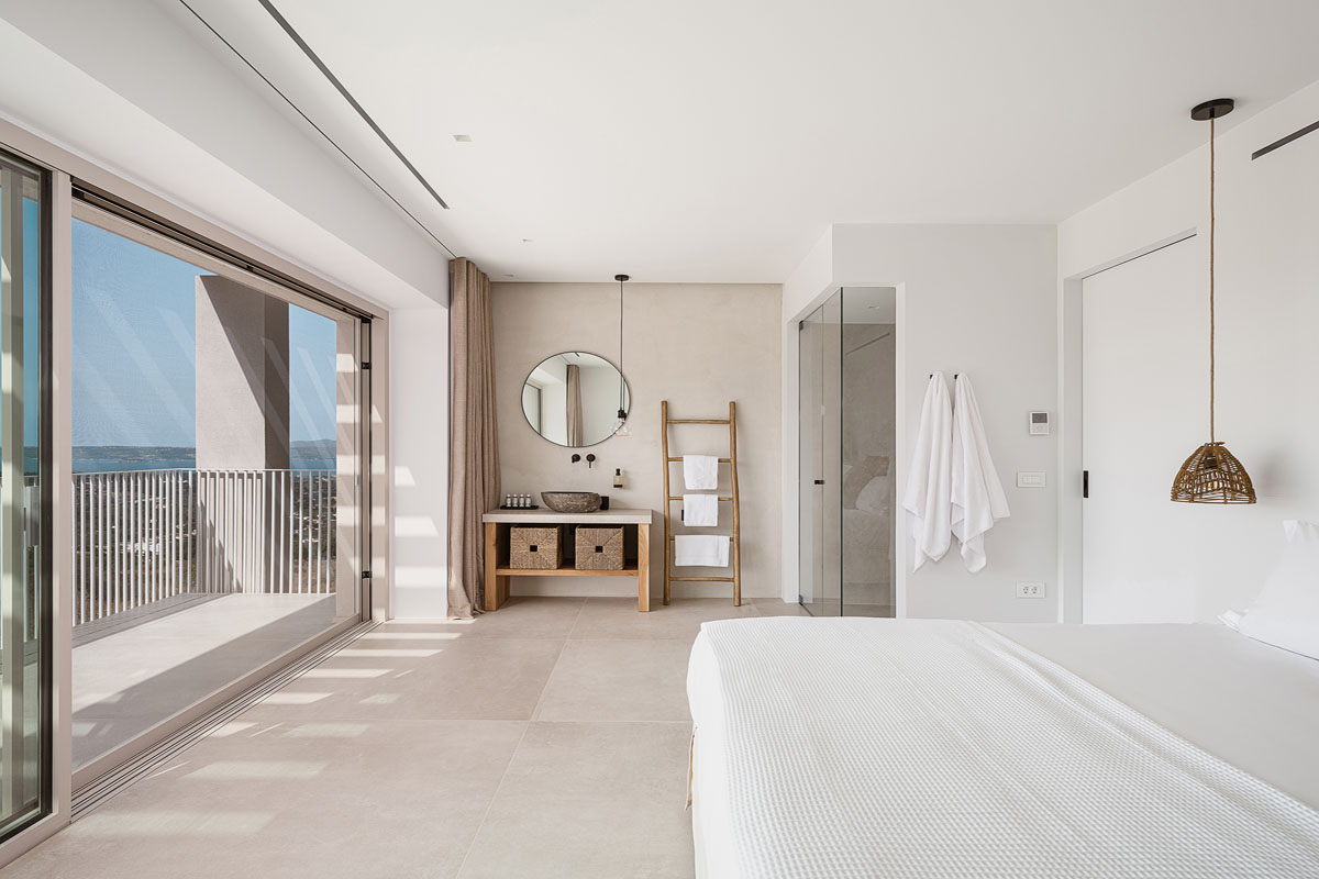 The outdoor space of the villa is designed to offer both luxury and relaxation, providing a perfect retreat with stunning views of Souda Bay and the White Mountains. The highlight is a private pool with a hydro massage feature, ideal for enjoying the serene surroundings. Around the pool, there are sun lounge chairs with umbrellas, providing comfortable spots for sunbathing and relaxation.