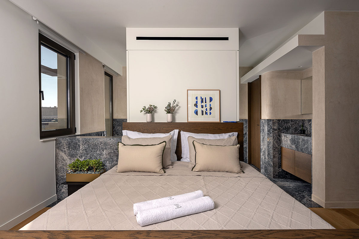 On the upper floor there are two double bedrooms. The master bedroom features en-suite bathroom with a bathtub and toilet. The second double bedroom has its own stylish shower enclosure and sinks (no toilet). Both rooms offer private balconies with sitting areas where guests can enjoy the breathtaking views of the sea and amazing scenery. On this level there is also a separate bathroom with a shower, sink and toilet.