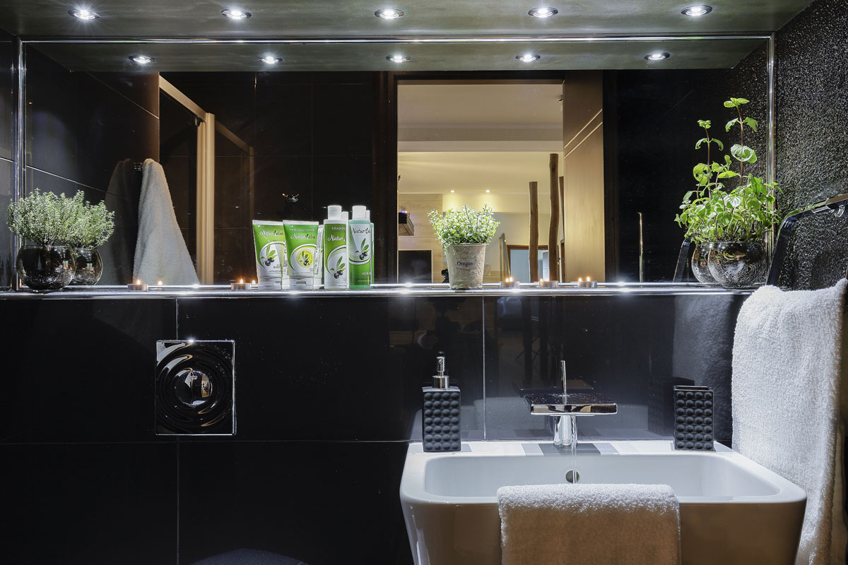 Villa Thea has a 330 sqm interior area and is built on two levels. The ground floor consists of four bedrooms all en-suite, two of them with a double bed and two of them with two twin beds which can be converted into doubles. A staircase leads on the lower ground floor where the large living room and the sitting room are located with a dining area for 12 guests. A large fully equipped kitchen and an indoor heated pool with Jacuzzi and reverse swim jet are located as well on this level.