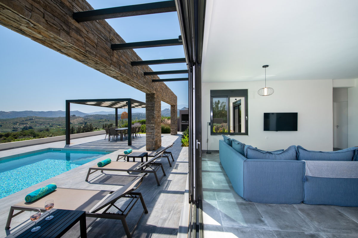 Immerse yourself in the serenity of the private pool, surrounded by sunbeds, loungers, and pool towels for a leisurely day in the Cretan sun.