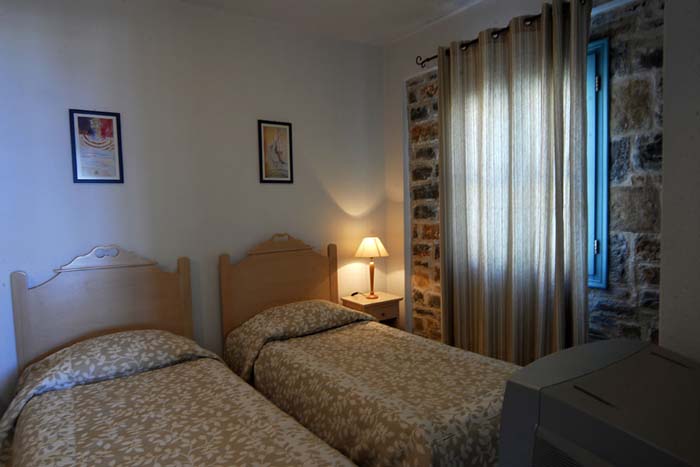 The sitting room is decorated with light colours and the furniture is inspired by the Cretan traditional style.