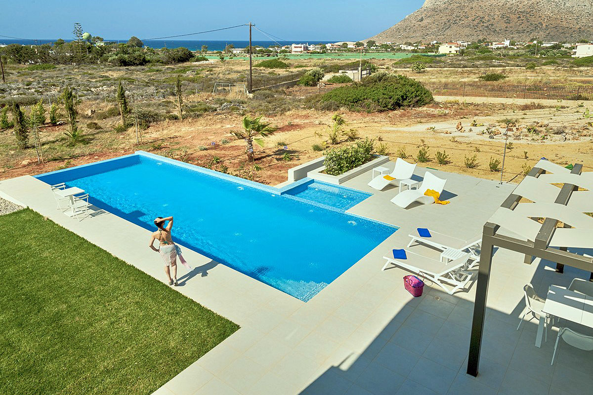There are large terraces around the villa with sun loungers and recliners.A Jacuzzi and its outdoor lounge are located on the second floor, overlooking the Cretan sea, where you can relax at the end of the day and enjoy the beautiful sunsets.