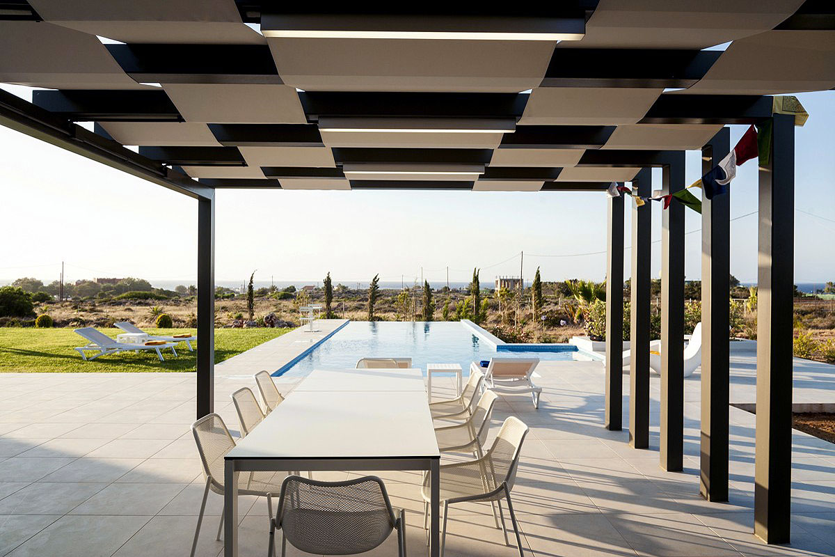 The modern pergola has a covered outdoor dining area with seating for 8 people with views of the pool, the sea and the Stavros mountain.