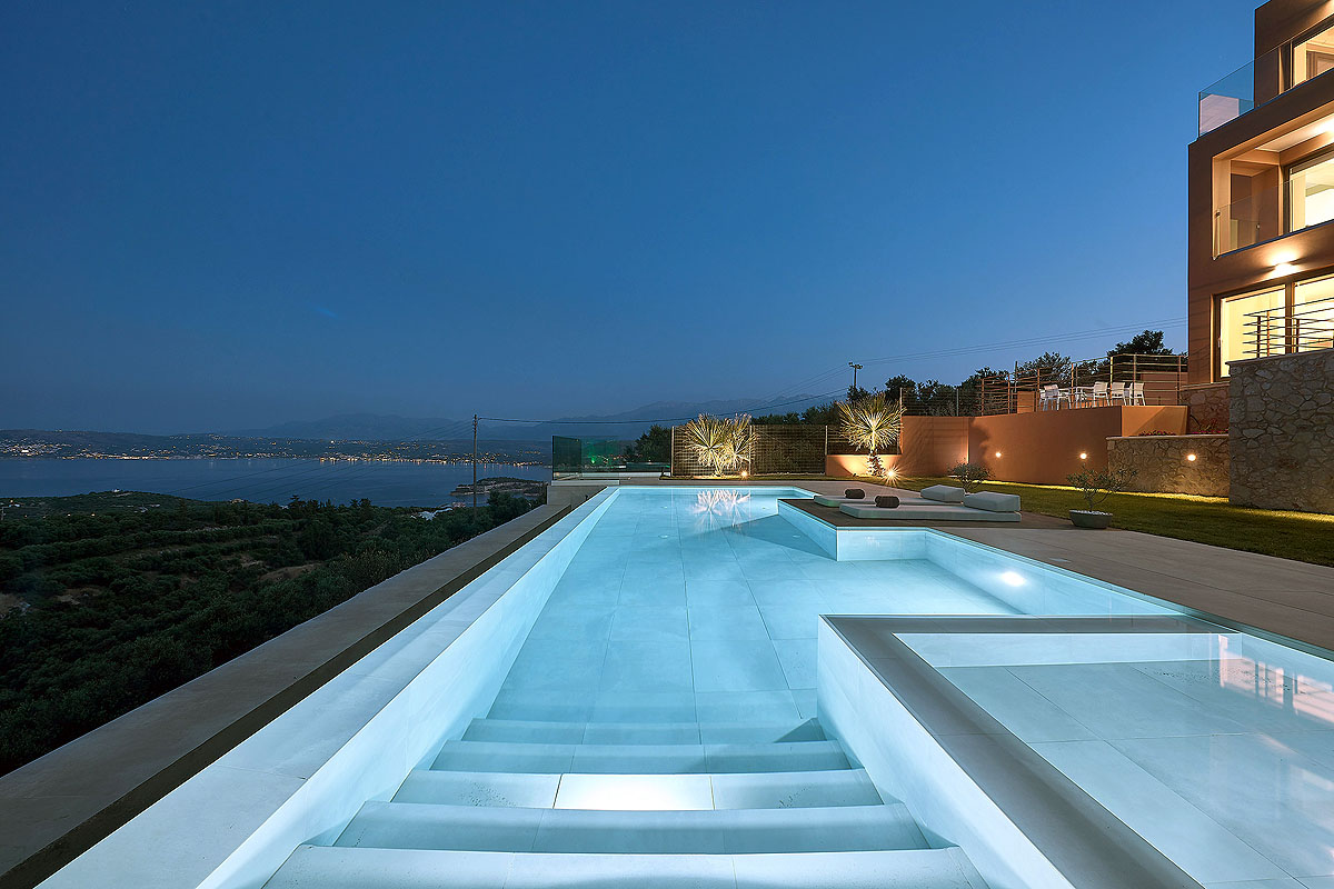 The interior design of Villa Niolos II is modern and its layout functional, comfortably accommodating 5 guests in its 3 bedrooms and up to 7 people if necessary. Entering the villa on the ground floor, you will find a spacious open plan area which is consisted of the living room and kitchen. The living area features a comfortable corner sofa, coffee table, 55’’ HDTV and an indoor dining area and offers direct access to a veranda equipped with outdoor furniture. Next to it, the kitchen is fully equipped with all essential appliances to make your self catered holiday as easy as possible, and provides a breakfast counter and direct access to a veranda with an outdoor dining area and the gas barbecue grill. The whole room is bright and airy and enjoys beautiful sea views. A bathroom with shower and a separate storage room with a washing machine can also be found on the same floor. On the first floor guests can find two of the bedrooms of Villa Niolos II, one of which offers a single bed and dressing table, while the other features a king sized double bed (1,80 X 2,00), which can also be set up as two single beds (0,90 X 2,00) upon request. Both bedrooms are air conditioned and offer access to balconies equipped with patio furniture, enjoying magnificent views of the sea and overlooking the pool. An additional bathroom with bathtub is also available on this level. Following the stairs to the second floor, you will reach a beautiful attic that hosts the master bedroom. The room boasts a double bed (1,60 X 2,00), open closet, small refrigerator and an en-suite bathroom with shower cabin. Large doors and windows exit to private balcony with siting area offering panoramic views of Souda Bay, the sea and the surrounding area and also overlooking the pool.