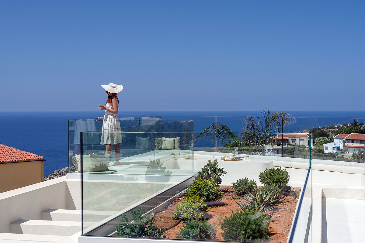 The heated Infinity Swimming pool of 67 sq.m. is perfect for a refreshing swim while taking in the stunning views. This villa offers a perfect blend of modern design and natural Cretan terrain, with the use of onyx, luxurious gold details, natural stone, iroko decking, and bespoke furniture constructions throughout the house.