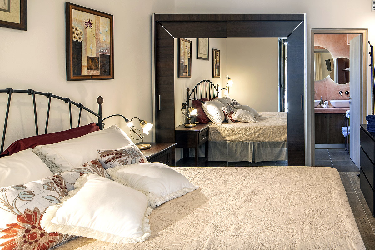The whole villa is ground level and handicapped accessible and has two master bedrooms. The west-facing master bedroom features an antique-like cast iron bed with Cocomat (the best eco-friendly Greek) top mattress, and has a private bathroom with a Whirlpool tub/shower combination and two sinks. It has a patio door opening onto a private alcove, with marble table, stone benches and barbecue, where you can sit below the thick shadows of a large lemon tree. You will love spending the warm summer hours there, with your favorite novel and a glass of cold lemonade (yes, you can make it yourself by picking lemons from the tree!).